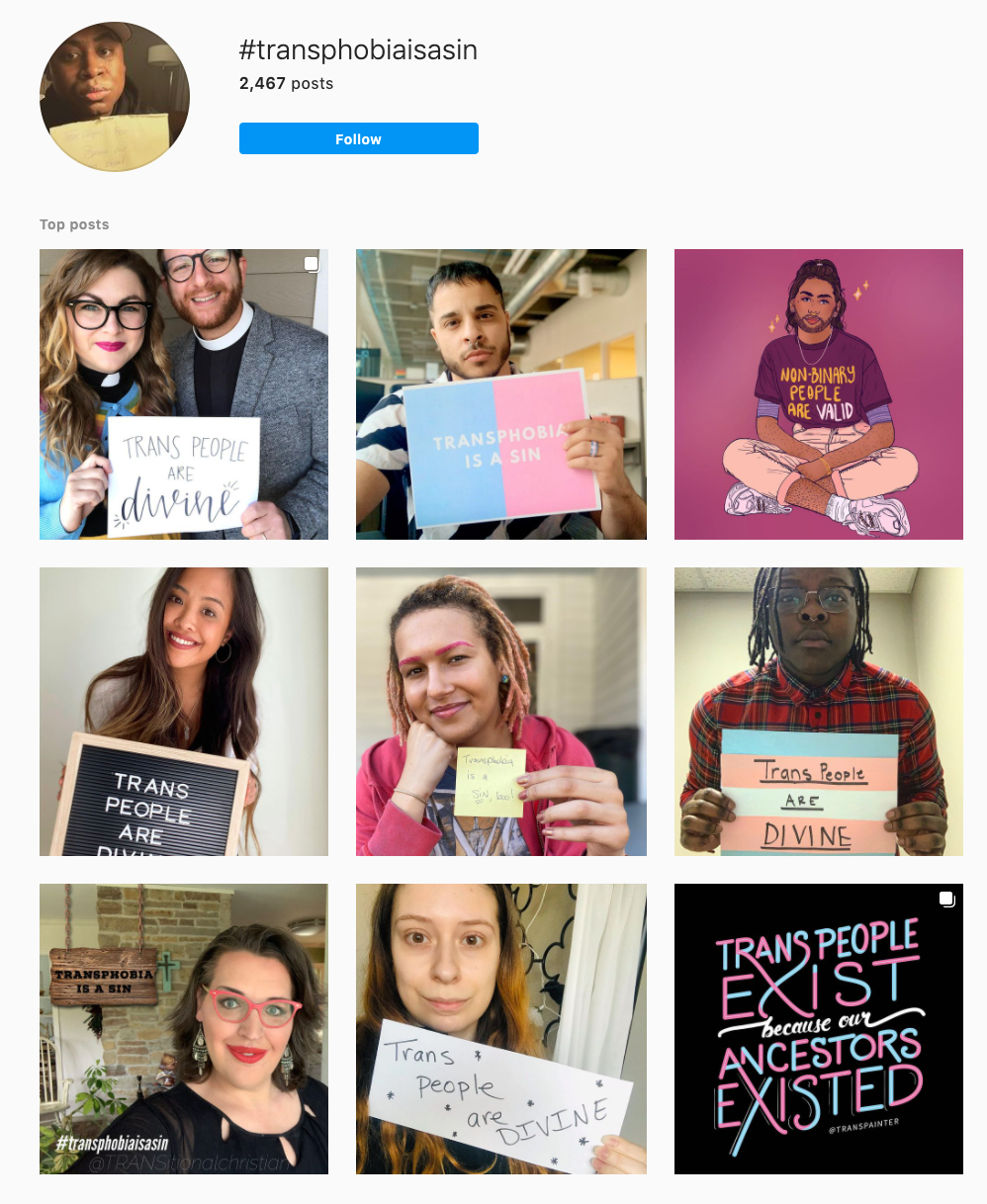 Jacy created this sign for the #TransphobiaIsASin Movement on Instagram, a movement that called out religious persecution of Trans People. Folx were encouraged to print out a sign that said "Trans People Are Divine", take a photo with it and post it to social media with the hashtag #TransphobiaIsASin